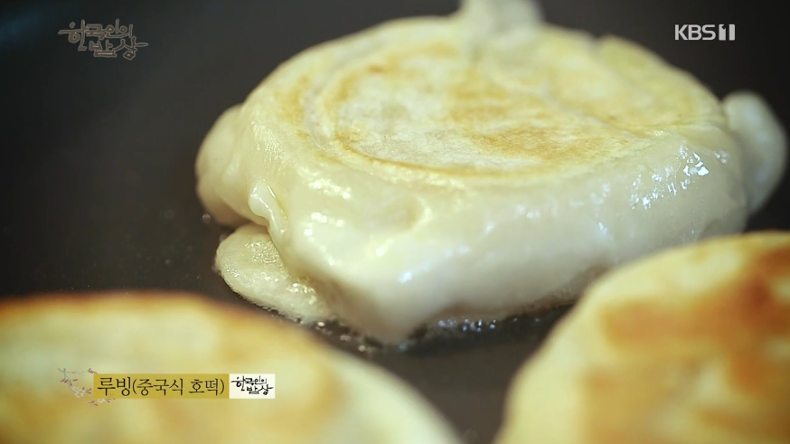 ‘루빙(중국식호떡)’은 밀가루에 뜨거운물을 조금씩 넣으면서 익반죽을 한 뒤에 한 덩어리 위에 마가린을 바르고 넓게 밀어 다시 돌돌 말아줍니다. 먹기 좋게 잘라 기름을 두른 팬에서 둥글게 눌러주면서 구워줍니다.