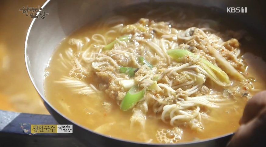 ‘생선국수’는 끓는 물에 가물치, 붕어 등 민물고기를 넣고 푹 삶아서 힘있게 저어서 채에 물을 뿌리면서 굵은 뼈만 걸러내고 된장을 풀고 파를 넣고 국수를 넣어서 삶아줍니다.
