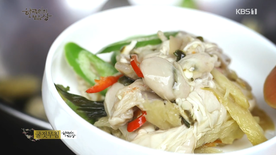 ‘굴젓무침’은 푹 삭힌 굴젓에 마늘편, 고추, 북어채, 잘게 부순 마른미역 등을 넣고 무쳐줍니다.