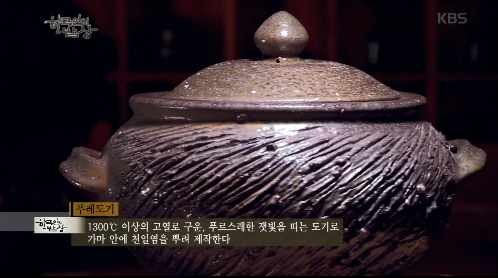 푸레도기는 푸르스레하다는 어원을 가진 도기입니다. 옹기의 한 종류로 궁중 출토 유기에 해당하는 것으로 보아 왕실옹기로 사용했을거라는 추측을 합니다. 채취한 흙을 숙성을 해서 불순물을 제거하고 얼었다 녹았다를 반복하면서 3년 후에 사용한다고 합니다. 푸레도기는 금강송 통나무를 태워 1300도 높은 가마에서 5일 동안 피우면서 가마 안에 소금을 뿌리면서 굽습니다.