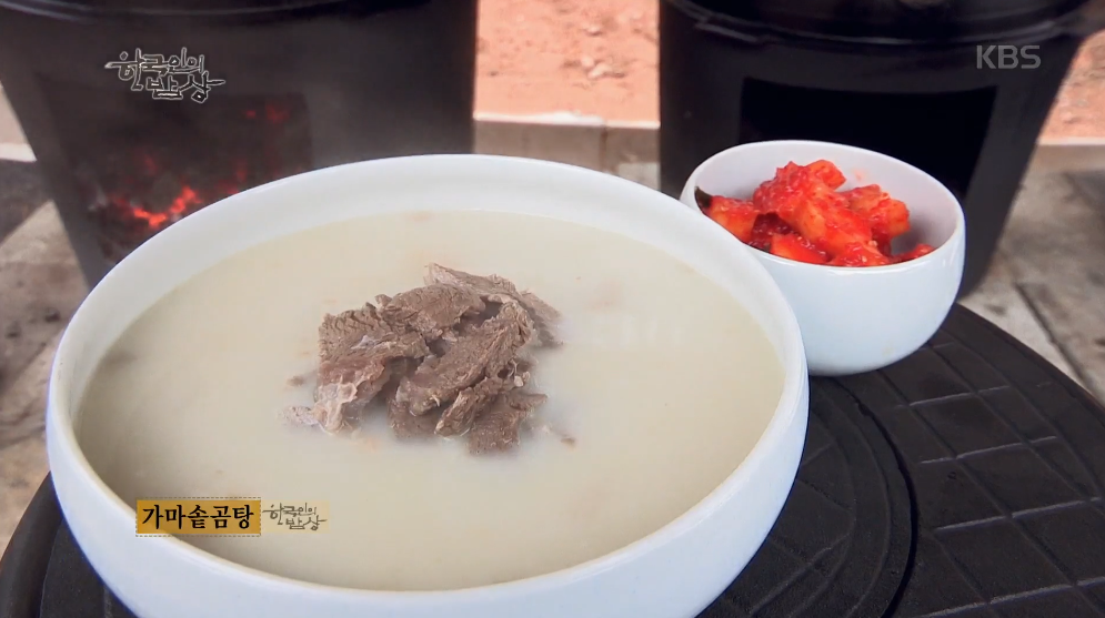 ‘가마솥곰탕’은 솥에 피물 뺀 소뼈와 고기덩어리를 넣고 찬물을 붓고 푹 끓여줍니다. 고기를 건져 얇게 썰어 고명으로 올립니다.