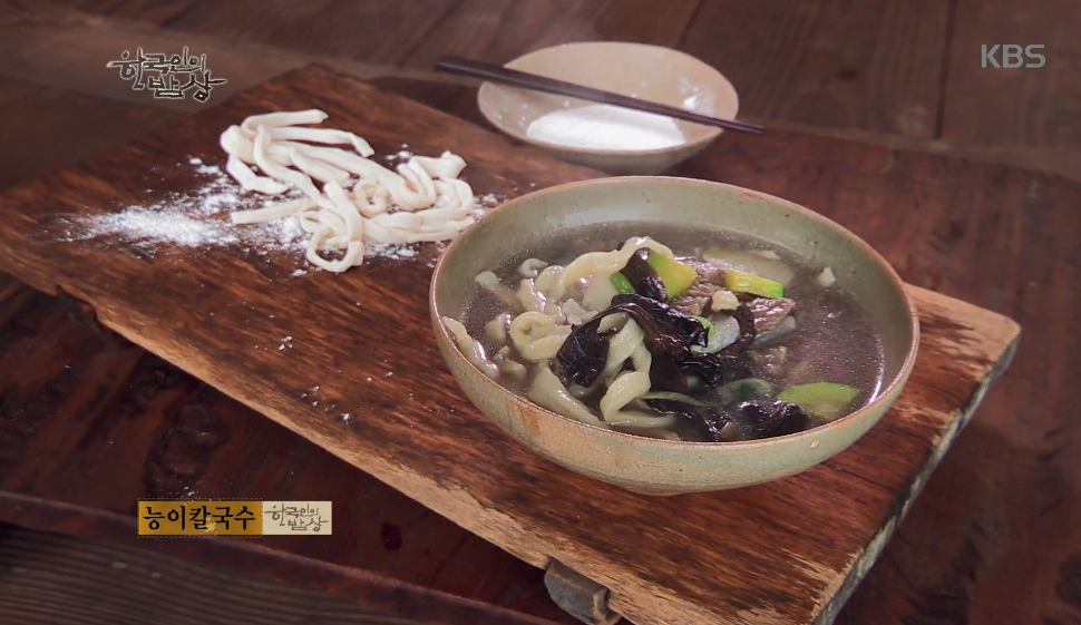 ‘능이칼국수’는 밀가루 반죽을 해서 산초나무(향이남) 밀대로 밀어 줍니다. 솥에 무와 양지머리를 넣고 끓이다가 말린 능이버섯을 물에 불렸다가 넣어 끓입니다. 그리고 국수와, 애호박 등을 넣고 끓입니다.