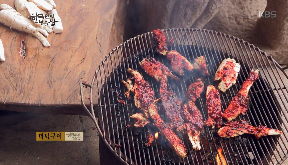 ‘더덕구이’는 산더덕을 칼로 긁어 손질을 하고 관솔로 더덕을 쳐서 넓게 펴주고 숯에 올려 굽다가 고추장 양념을 발라 한 번 더 구워냅니다.