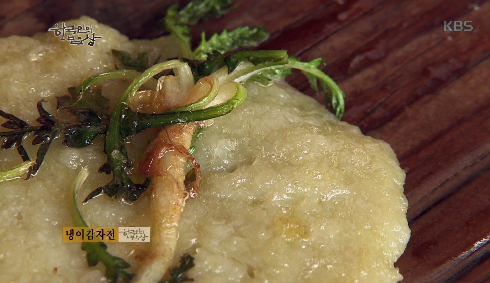 ‘냉이감자전’은 감자를 갈아 둥글게 팬에 기름을 두르고 부치고 그 위에 냉이를 올리고 구워줍니다.