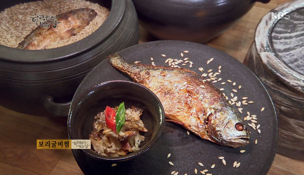 ‘보리굴비찜’은 독 속에 겉보리를 가득채워 보관한 굴비를 꺼냅니다. 한 번 씻은 보리굴비(부세)를 찜기에 올려 쪄줍니다.