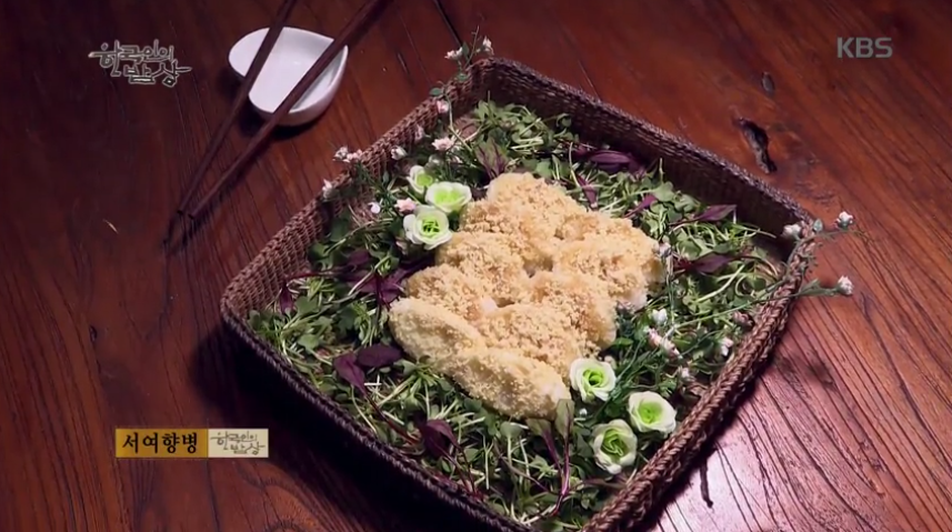 ‘서여향병’은 마를 얇게 썰어 찐 다음 꿀에 재웠다가 찹쌀가루를 발라 기름에 지져줍니다. 그리고 잣가