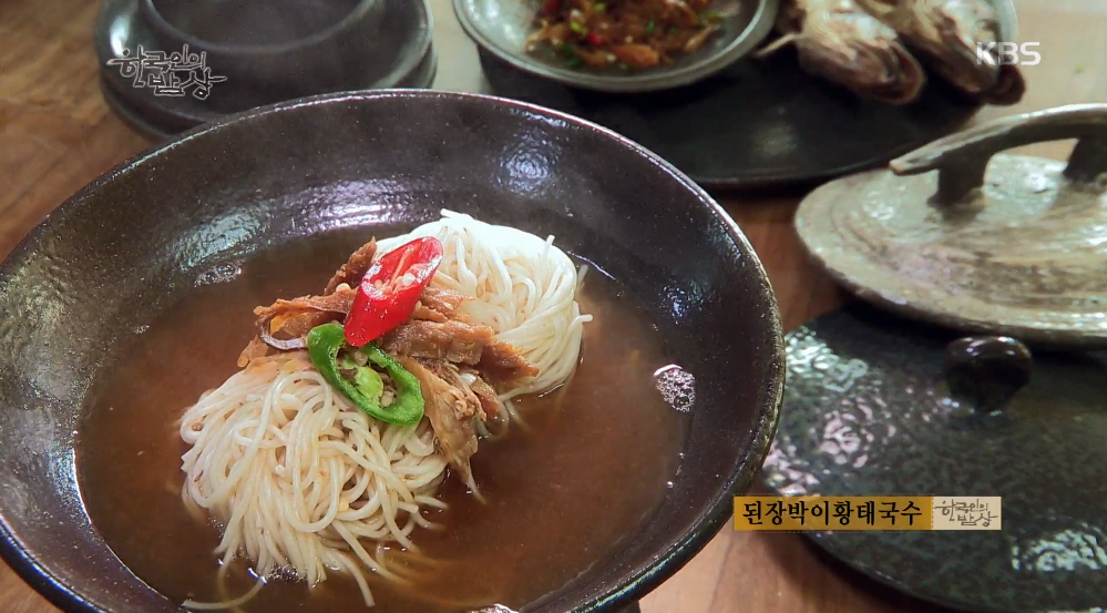 ‘된장박이황태국수’는 된장에 박아 두었던 황태를 꺼내서 토막을 내고 냄비에 넣고 무, 고추 썰어 넣고 끓입니다. 그리고 국수를 삶아 그릇에 담고 국물을 붓고 황태살을 찢어 올려줍니다.