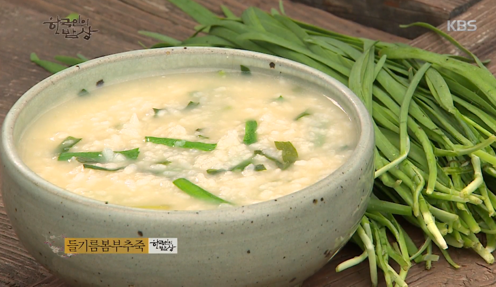 ‘들기름봄부추죽’은 쌀을 씻어 들기름을 넣고 계속 치대서 끓는 물에 넣고 간장으로 간을 하고 끓입니다. 다 됐을 때쯤 부추를 썰어 넣고 한소끔 끓입니다.