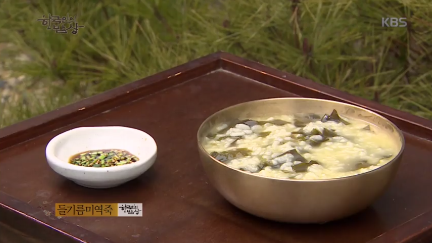 ‘들기름미역죽’은 쌀을 씻어 들기름을 넣고 계속 치대서 끓는 물에 넣고 간장으로 간을 하고 끓입니다. 그리고 불린 미역을 썰어 넣어 끓여줍니다.