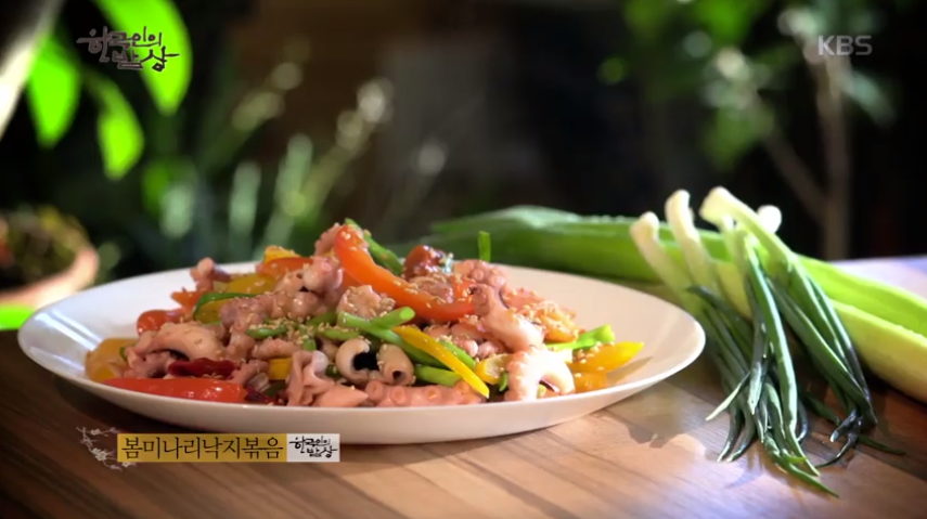 ‘봄미나리낙지볶음’은 낙지를 손질해서 먹기 좋게 썰은 다음 당근, 고추와 함께 기름에 볶다가 파프리카 미나리와 함께 볶아 냅니다.