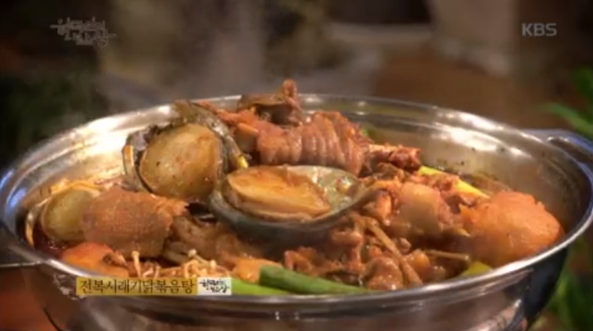‘전복시래기닭볶음탕’은 씨암탉을 손질해서 토막을 내서 물에 넣어 핏물을 뺍니다. 그리고 압력밥솥에 넣고 통감자, 시래기, 간장, 고춧가루, 고추장 등을 넣고 푹 끓입니다. 그리고 냄비에 옮겨 파, 팽이버섯, 전복을 올려 한소끔 끓입니다.