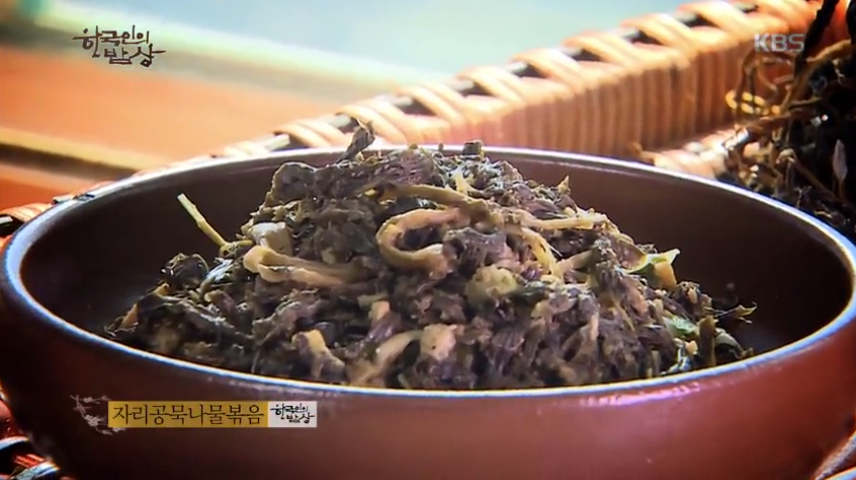 ‘자리공묵나물볶음’은 말린 자리공 잎사귀를 삶은 뒤에 물기를 짜고 냄비에 넣고 간장, 들기름, 들깨가루, 버섯가루, 다진마늘 등을 넣고 무쳐서 양파를 넣고 볶아줍니다.