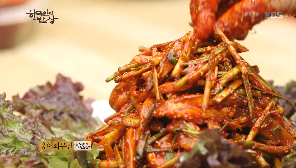 ‘웅어회무침’은 웅어는 잘 씻어 손질한 뒤에 뼈채 얇게 썰어 미나리, 고추장, 식초, 깨 등을 넣고 무쳐줍니다.