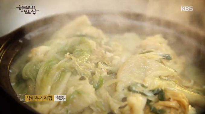 ‘삭힌우거지찜’은 김장을 하고 남은 배추잎을 소금에 절여서 깨진독에 넣어서 물이 빠지면서 삭힙니다. 씻어서 냄비에 넣고 들기름 넣고 달달 볶다가 새우젓과 다진마늘을 넣고 쌀뜨물을 조금 넣고 지져줍니다.