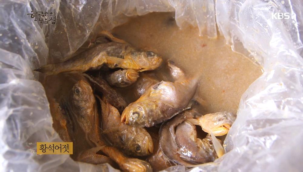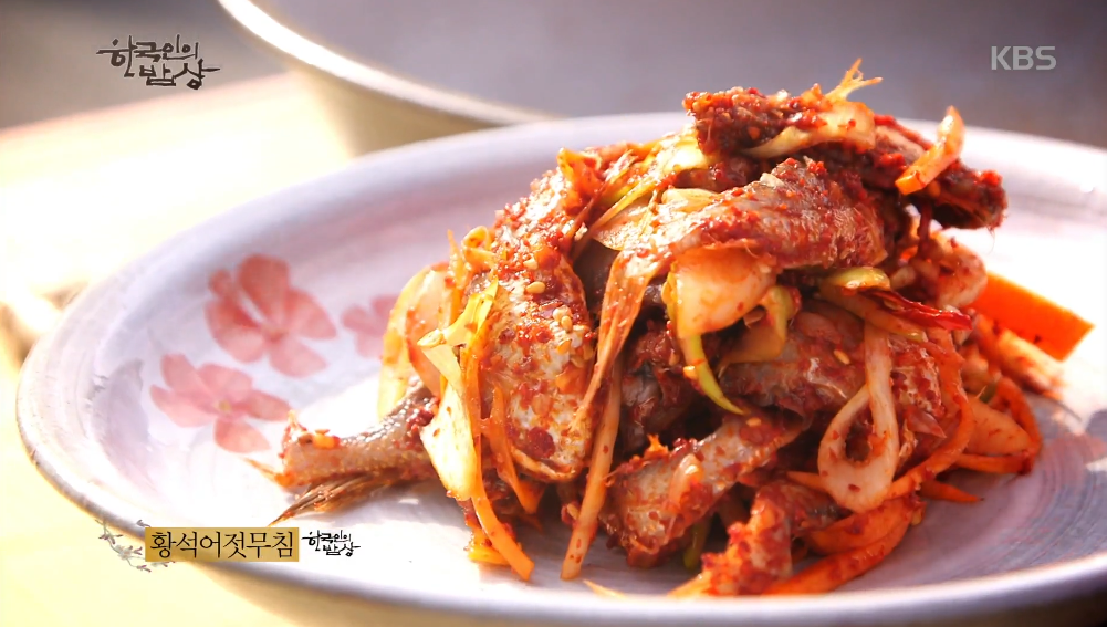 ‘황석어젓무침’은 황석어젓을 머리와 내장을 빼고 양파, 당근, 고추, 대파 등 야채를 어슷썰어 넣고 고춧가루로 양념을 해서 비벼줍니다.