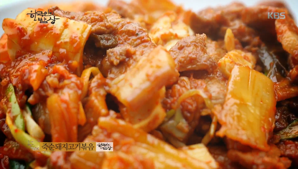 ‘죽순돼지볶음’은 빨갛게 묻힌 돼지고기를 김치랑 같이 넣고 볶다가 죽순을 찢어 볶고 마지막 간은 어간장으로 잡습니다.