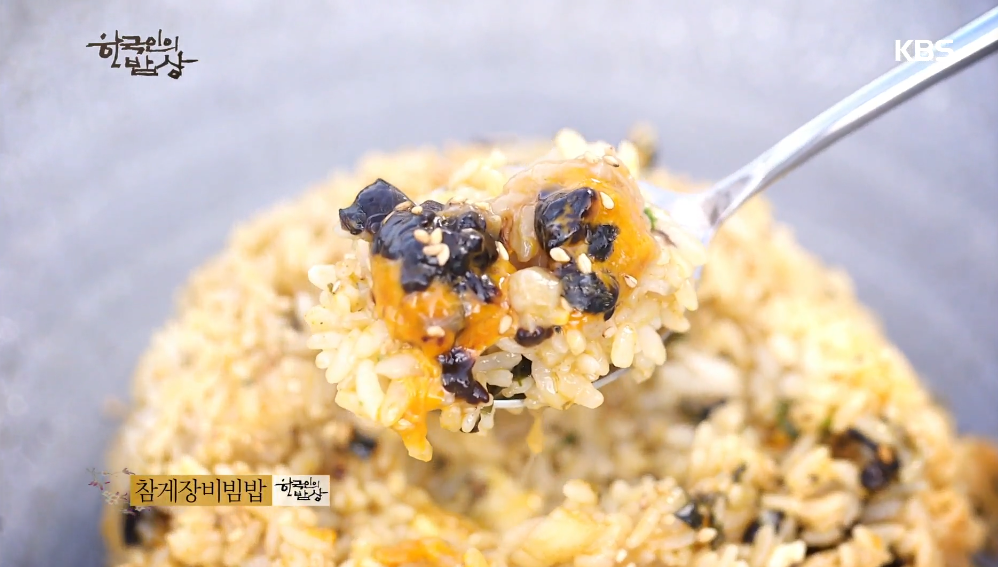 ‘참게장비빔밥’은 산 참게를 간장물에 넣고 10일 숙성을 합니다. 흰 밥에 계란 반숙올리고 참게장살을 꽉 짜서 김가루, 참기름, 깨를 넣고 참게장국물을 넣고 비벼줍니다.