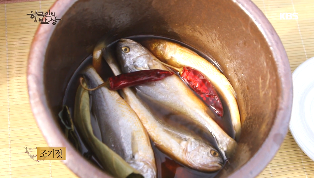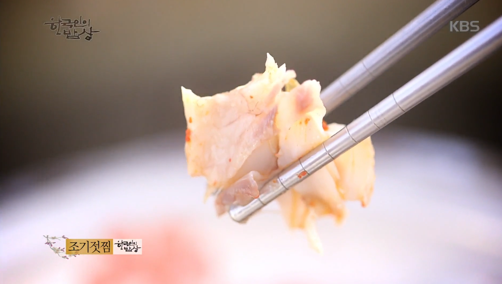 ‘조기젓찜’은 조기젓을 찻물에 20분 정도 담가 짠 맛을 빼고 칼집을 낸 뒤에 고춧가루, 다진파, 건고추를 올리고 20분 정도 쪄줍니다.