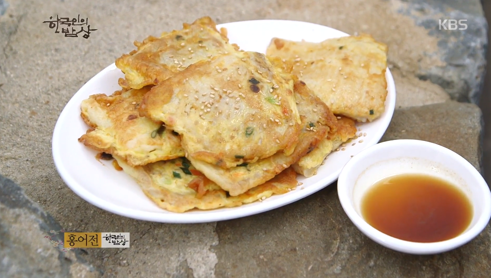 ‘홍어전’은 홍어를 먹기 좋게 썰어 밀가루옷, 계란옷을 입혀서 팬에 기름을 두르고 부쳐줍니다.