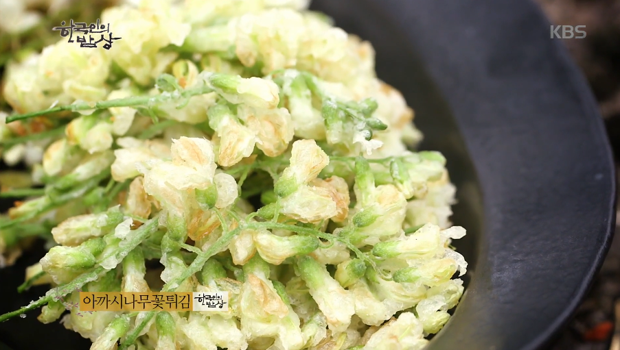 ‘아카시아나무꽃튀김’은 아카시아꽃을 송이째 튀김옷을 입혀서 기름에 튀겨냅니다.