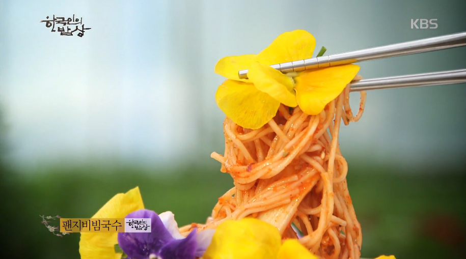 ‘팬지비빔국수’는 홍초와 팬지를 울린 차에 고추장, 다진마늘, 고춧가루, 말린 팬지꽃가루, 잣가루 등을 넣고 섞어줍니다. 소면을 삶아 양념을 넣고 비벼줍니다. 그리고 고명으로 생 팬지와 오이채를 올려줍니다.