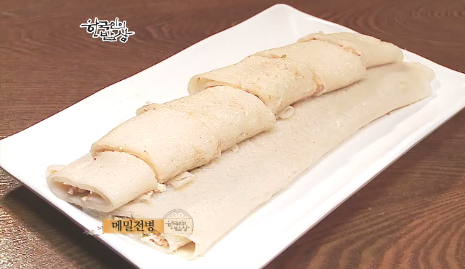 ‘메밀전병’은 두부를 만들고 나면 두부를 으깨고, 김장김치를 송송썰어 꽉 쫘주고 메밀반죽을 얇게 부친다음 속을 넣고 돌돌 말아서 먹기 좋게 썰어줍니다. 메밀전병에는 옥수수막걸리가 어울린다고 합니다.