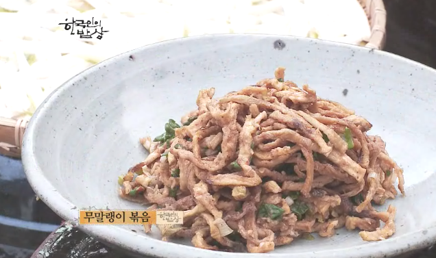 ‘무말랭이 볶음’은 무말랭이를 기름발린 철판에 놓고 들깨가루, 파, 마늘, 간장을 넣고 볶습니다. 말린 나물, 채소들은 수분이 빠져나가기 때문에 그 속에 존재하는 단백질이나 탄수화물, 지방 같은 이런 일반 성분들이 아무래도 농도가 높아지게 됩니다. 따라서 건조 산채류에는 약 2배~10배 정도까지 건조하지 않은 산채류보다 훤썬 더 많은 영양분이 존재합니다.