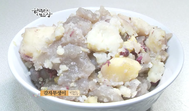 ‘감자투생이’는 끊는 물에 감자와 강낭콩을 넣고 익힙니다. 그리고 감자 전분을 익반죽을 한 다음 익은 감자 위에 수제비처럼 잘라서 위에 올려주고 다시 익힙니다. 심심하고 투박한 맛이난다고 합니다. 감자 전분을 만들기는 힘들지만 만들어 놓으면 감자떡도 만들어 먹고 겨울에 든든한 식량이 됩니다.