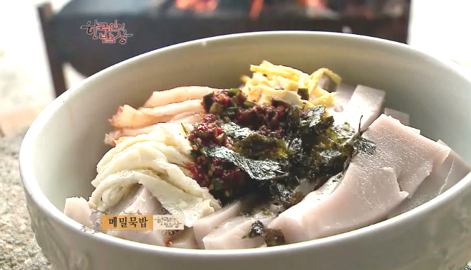 ‘메밀묵밥’은 메밀묵을 채썰어 넣고 겨울에 많이 나는 무를 양념해서 얻고 그 위에 김가루얻고 파, 깨소금 얻고 육수를 부어주고 거기에 조밥 한그릇 말아먹으면 그 맛이 참 좋습니다.