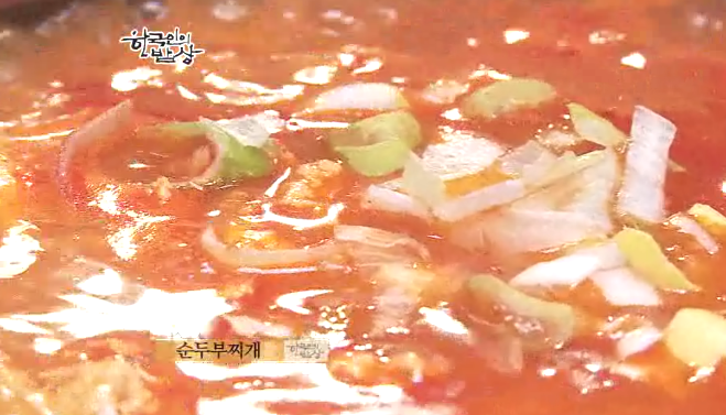 ‘순두부 찌개’는 바지락과 고기를 넣고 그 위에 순두부를 얻은 뒤에 계란을 얻고 끊여줍니다.