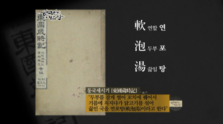 『동국세시기』에 보면 ‘두부를 잘게 썰어 꼬치에 꿰어서 기름에 지지다가 닭고기를 섞어 끓인 국을 연포탕이라고 한다.’라고 나와 있습니다.