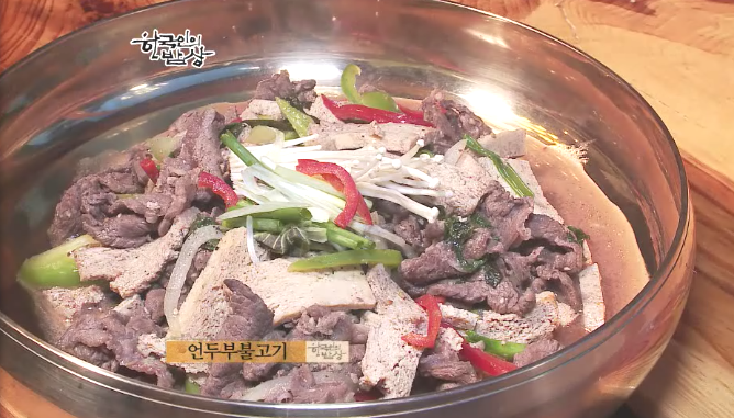 ‘언두부 불고기’는 뜨거운 물에 소금을 타고 언두부를 넣고 살짝 데쳐 냅니다. 먹기 좋게 썰어서 양념을 한 뒤에 불고기와 함께 넣어 볶습니다. 볶아도 깨지지 않고 쫄깃한 식감이 납니다.