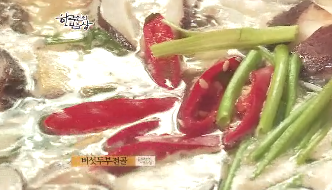 ‘버섯두부전골’은 갖가지 버섯과 채소를 깔고 두부를 올린 뒤에 끊입니다. 겨울철 두부는 스님들에게 없어서는 안될 단백질 공급원입니다.