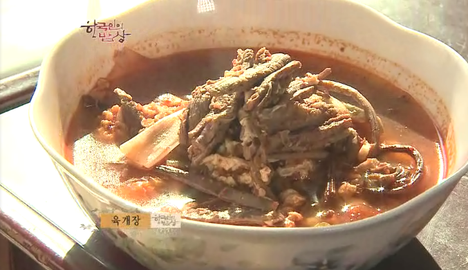 ‘육개장’은 양지머리고기로 육수를 내고 고기를 잘게 찢어 고추가루 양념을 하고 고사리, 파를 넣고 계란 푼물을 넣고 끓입니다.