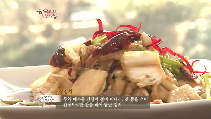 ‘장김치’는 간장에 절인 김치입니다. 배추, 파, 미나리, 배, 무, 대추, 밤, 실고추 등을 썰고 설탕을 넣은 집간장에 버무려서 항아리에 넣어 이틀 보관하면 맛있다고 합니다. 주로 12월 초에 담가먹었다고 합니다.