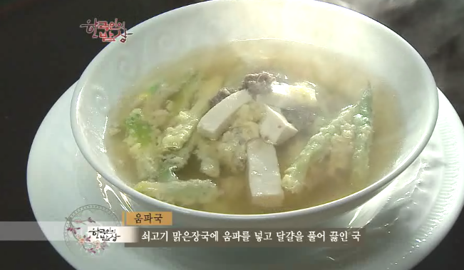 ‘움파국’은 서울 토박이의 겨울 음식이였습니다. 움파를 썰고 밀가루를 뿌린 후 푼 달걀을 붓습니다. 고기는 잘게 다져서 양념을 한 뒤에 끓는 물에 넣습니다.(그래야 고기 빛깔이 벌겋지 않고 맑은 국물이 됨). 그리고 두부를 넣은 뒤에 움파를 계란에 버무려서 넣어 줍니다.