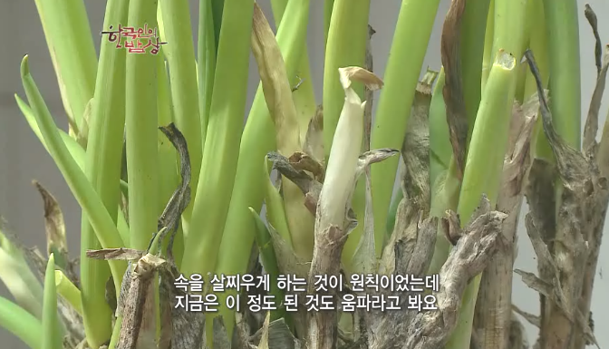 해를 안보이게 해서 기른 것을 ‘움파’라고 합니다. 예전에는 움파를 움 속에다 넣어서 해를 못보게 해서 노르스름하고 속을 살찌우게 하는 것이 원칙이었는데 지금은 이 정도 된 것도 움파라고 합니다. 정월에는 움파를 이용해서 떡국, 움파국 등을 끓였다고 합니다.