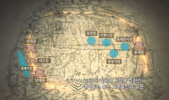 조선 후기에 와서 일반 시민에게도 상업할 수 있는 권한을 주게 되는데 그 이후로 종로 4가 지역에 해당하는 곳에 이현시장이 발달했고 그 명맥을 이어 광장시장, 동대문 시장이 그 맥을 이어가고 있습니다. 그 이외에 큰 시장 중심지는 서소문 밖 서울역 쪽으로 이어지는 그 근처 일대에 시전에 준하는 내어물전 혹은 외어물전과 같은 큰 상권이 발달하게 됩니다. 그 시장을 우리가 조선 후기에 칠패시장이라고 했습니다.