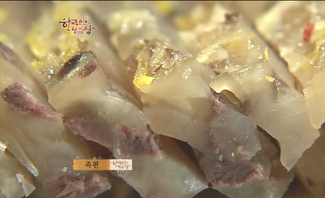 ‘족편’은 우족과 고기를 삶아 아주 잘게 다지고 파, 마늘을 넣고 양념을 한 뒤에 우족 삶은 물에 넣습니다. 그리고 고명을 올리고 식히면 됩니다. 족편은 궁중음식이 민가에 내려온 것입니다.
