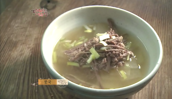 ‘소고기무국’은 끊는 물에 양지머리를 넣고 육수를 냅니다. 그리고 무를 나박하게 썰어넣고 고기가 익으면 꺼내고 파와 간장으로 간을 해서 끓입니다. 그리고 국을 푸고 잘게 찢어 양념한 고기를 올립니다. 지금은 생일 때 미역국을 먹지만 옛날에는 서울 어르신들 생신 때 뭇국을 드셨다고합니다.