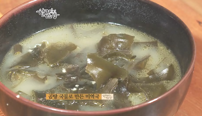 ‘곰탕미역국’은 미역 넣고 다진마늘 넣고 소고기 넣고 곰탕국물을 부은 다음 끊입니다.