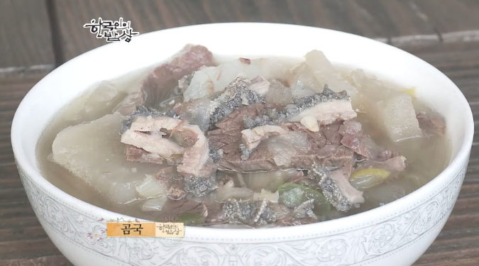 고기 속에 단백질이 많은데 곰탕을 끓일 때 단백질 성분이 분해가 됩니다. 그러면 이제 구성하고 있는 아미노산이 추출되어 나오는데 한편으로는 곰탕의 부족한 영양성분이 비타민하고 무기질이기 때문에 이 부분을 채소에서 섭취하면 아주 좋다고 합니다.