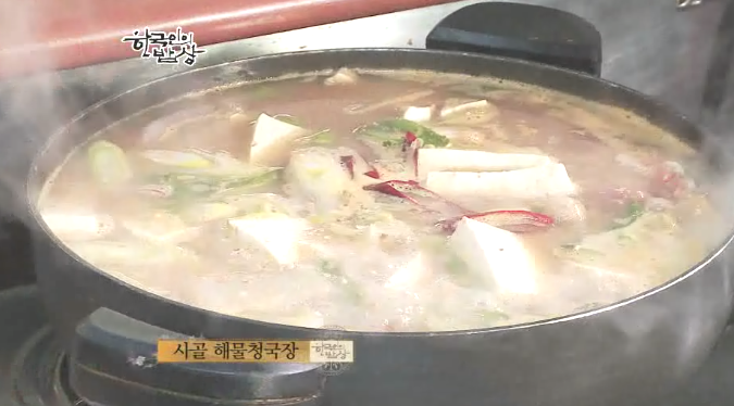 ‘사골 해물 청국장’은 사골 국물에 청국장을 풀고 무를 나박하게 썰어 넣습니다. 거기에 손질한 게를 몇 마리 넣고 산낙지도 통째로 넣고 조개를 넣습니다. 그리고 끓으면 두부를 넣고 고추도 송송 썰어 넣고 끓입니다.