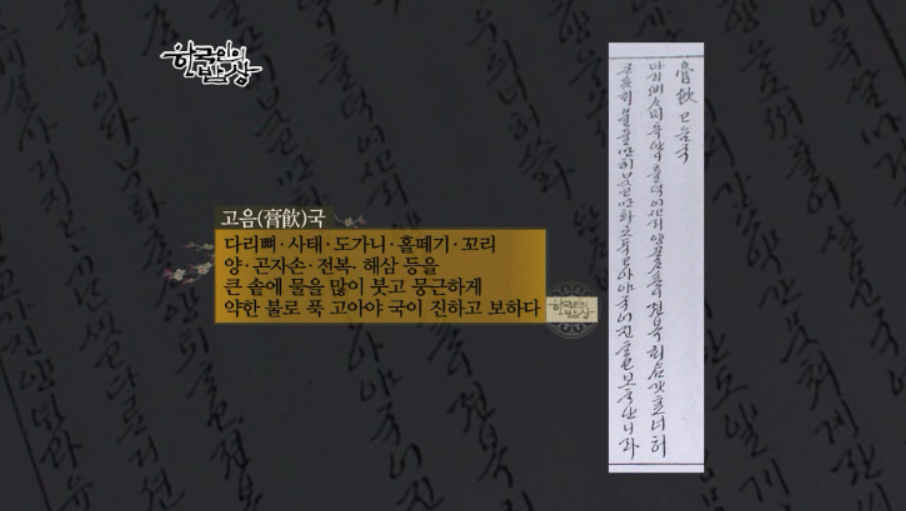 곰탕이 우리 밥상에 오른 것은 언제부터 일까요? 곰탕의 유래는 『시의전서(19세기 말엽 쓰인 조선 시대 음식 조리서)』에 기록 되있는 ‘고음’이라는 말에서 찾을 수 있습니다. ‘고음국은 다리뼈∙사태∙도가니∙홀떼기∙고리양∙곤자손∙전복∙해삼 등을 큰 솥에 물을 많이 붓고 뭉근하게 약한 불로 푹 고아야 국이 진하고 보하다.’라고 나와 있습니다.