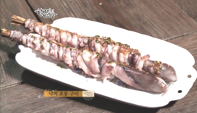 ‘낙지호롱’은 낙지를 손질해서 낙지 머리를 짚에 머리를 끼고 몸을 꼬아주고 양념을 발라 숯불에 굽습니다.