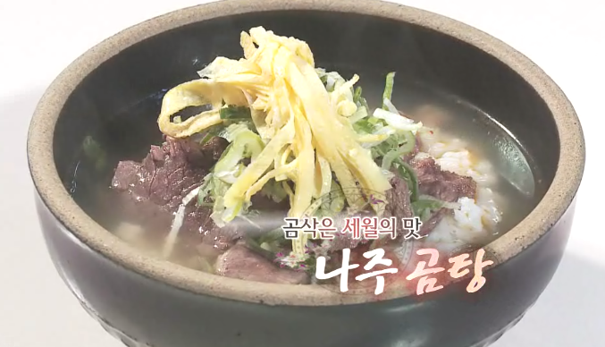 ‘나주곰탕’은 이경자할머니는 새벽 4시면 어김없이 곰탕 가마솥에 불을 지핍니다. 50년 가까이 곰탕을 끊인 할머니는 곰탕을 끊일 때 먼저 머릿고기를 삶아 육수를 만든다고 합니다. 양지나 사태만 삶아서는 진한 육수가 안나온다고 합니다. 한솥에서는 기름기가 적은 사태와 기름기가 많은 양지를 같이 삶아야 국물이 잘우러난다고 합니다. 한솥에서는 하루종일 뼈를 삶는데 그 국물을 고기삶는 두 솥에 부어가며 국물을 내린다고 합니다. 머릿고기는 두 세시간 삶으면 적당하게 삶아진다고 합니다. 고기는 그 때마다 손질해서 수육을 만든다고 합니다. 부위별로 맛이 달라서 잘 섞어서 손질해놓는다고 합니다. 우설이 제일 맛있다고 합니다. 곰탕은 고기 위주라서 국물이 갈색빛이 띄이는 것이 특징입니다. 밥을 토렴 한 뒤에 고기를 넣고 파, 지단, 고춧가루, 깨를 올리면 줍니다.