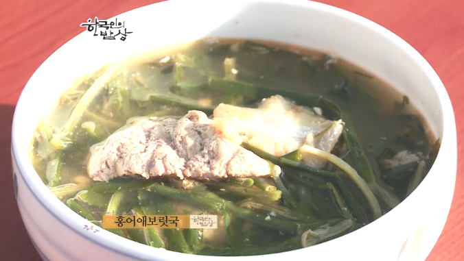 ‘홍어애 보릿국’은 솥에 불을 지펴서 물을 끊입니다. 그리고 된장을 풀고 2년 묵은 김치를 넣고 끊입니다. 그리고 보리싹을 듬뿍 넣고 섞어준 다음 한소끔 끊인 뒤에 홍어애를 넣습니다.