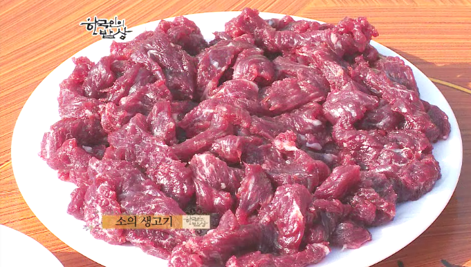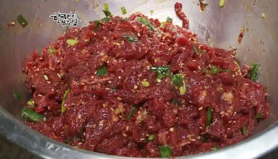 ‘육회’는 주문이 들어오면 정육점에 가셔서 우둔살을 사다가 해드립니다. 잘게 채친 고기에 다진마늘, 간장, 참기름 등 갖은 양념을 만들어서 육회를 만듭니다.