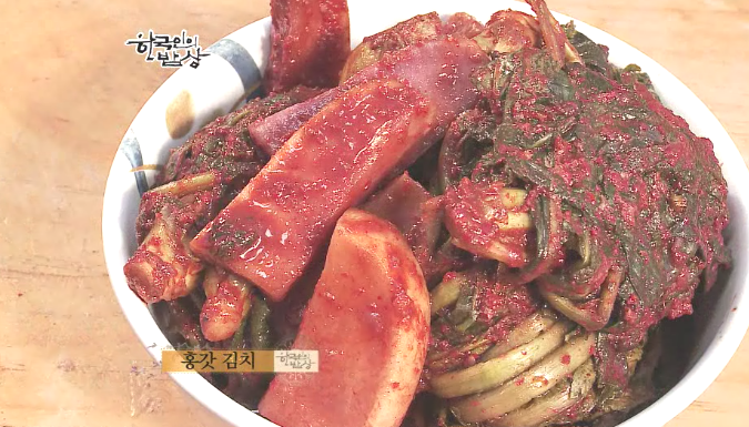 곰탕과 같이 먹을 ‘홍갓김치’를 만듭니다. 홍갓은 씻어서 다듬어 준비하고 육수는 표고버섯, 다시마, 보리새우, 밴댕이 젓갈, 황석어젓갈을 넣고 끊여 만듭니다. 육수에 새우젓, 멸치젓, 고춧가루, 찰밥(단맛과 김치가 잘 삭게 도와줌.)을 섞어서 양념장을 만들 다음 홍갓을 무칩니다.