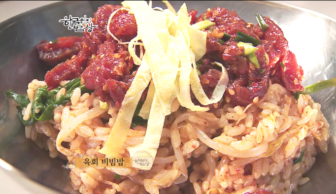 ‘육회비빔밥’은 밥에 간장과 참기름, 고춧가루를 넣고 곰탕국물을 넣고 숙주나물을 넣고 비빈다음에 육회를 얻습니다. 예전에는 돼지기름에 밥을 볶기도 했답니다.